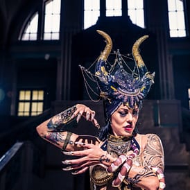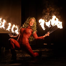 Elementen wie Feuer, Akrobatik/ Artistik und nach Bedarf auch einer Schlange setzt Sie ihre faszinierenden Kostüme,